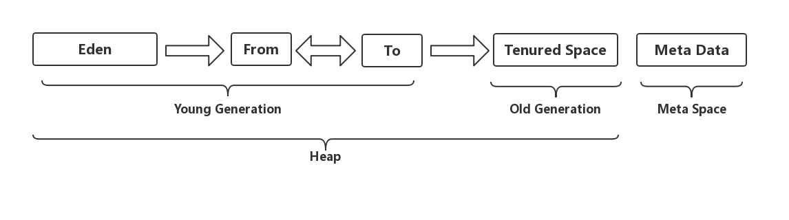 类出生、成长、消亡的区域,一个类在这里产生,应用,最后被垃圾回收器收集,结束生命。 新生代分为两部分:伊甸区(Eden space)和幸存者区(Survivor space),所有的类都是在伊甸区被new出来的。幸存区又分为From和To区。当Eden区的空间用完是,程序又需要创建对象,JVM的垃圾回收器将Eden区进行垃圾回收(Minor GC),将Eden区中的不再被其它对象应用的对象进行销毁。然后将Eden区中剩余的对象移到From Survivor区。若From Survivor区也满了,再对该区进行垃圾回收,然后移动到To Survivor区。